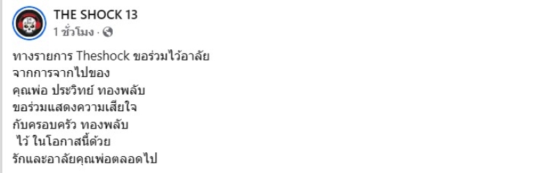 ขอแสดงความเสียใจด้วยนะคะ ล่าสุด ได้มีข่าวเศร้า เมื่อทาง เพจ THE SHOCK 13 ได้ออกมาเผยว่า ทางรายการ Theshock ขอร่วมไว้อาลัย จากการจากไปของ คุณพ่อ ประวิทย์ ทองพลับ ขอร่วมแสดงความเสียใจ กับครอบครัว ทองพลับ ไว้ ในโอกาสนี้ด้วย รักและอาลัยคุณพ่อตลอดไป