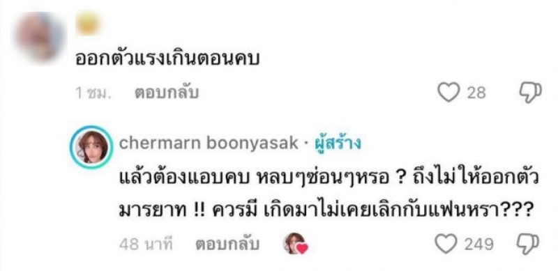 ออกตัวแรงเกินตอนคบ โดยทางด้าน พลอย เฌอมาลย์ ไม่ปล่อยให้รอนาน ตอบกลับคอมเมนต์ดังกล่าวทันทีว่า แล้วต้องแอบคบ หลบๆซ่อนๆหรอ ? ถึงไม่ให้ออกตัว มารยาท !! ควรมี เกิดมาไม่เคยเลิกกับแฟนหรอ???