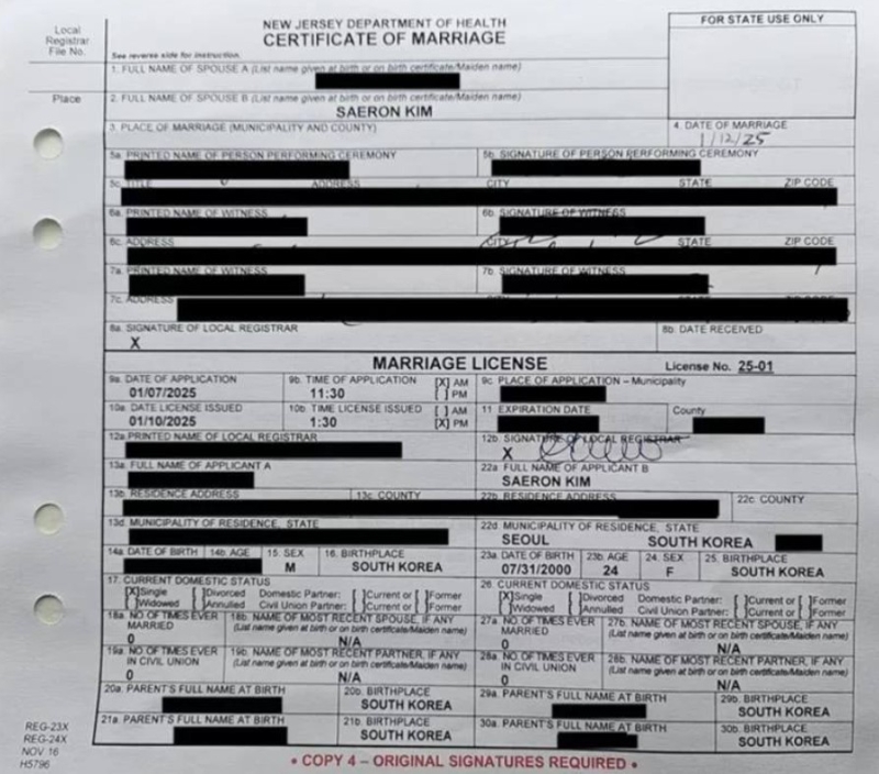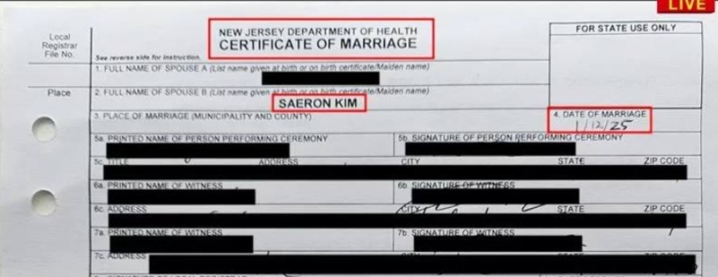 นอกจากนี้ สามีที่ถูกกล่าวหาว่าทำร้ายร่างกายคิมแซรนในบ้าน ก็ได้ให้สัมภาษณ์กาเซยอนเช่นกัน และเปิดเผยใบทะเบียนสมรสของเขากับคิมแซรน ซึ่งระบุว่าพวกเขาแต่งงานกันเมื่อวันที่ 12 มกราคม พ.ศ. 2568 (แตกต่างจากเสียงบันทึกที่อีจินโฮเปิดเผยว่าเป็นวันที่ 8 มกราคมก่อนหน้านี้)