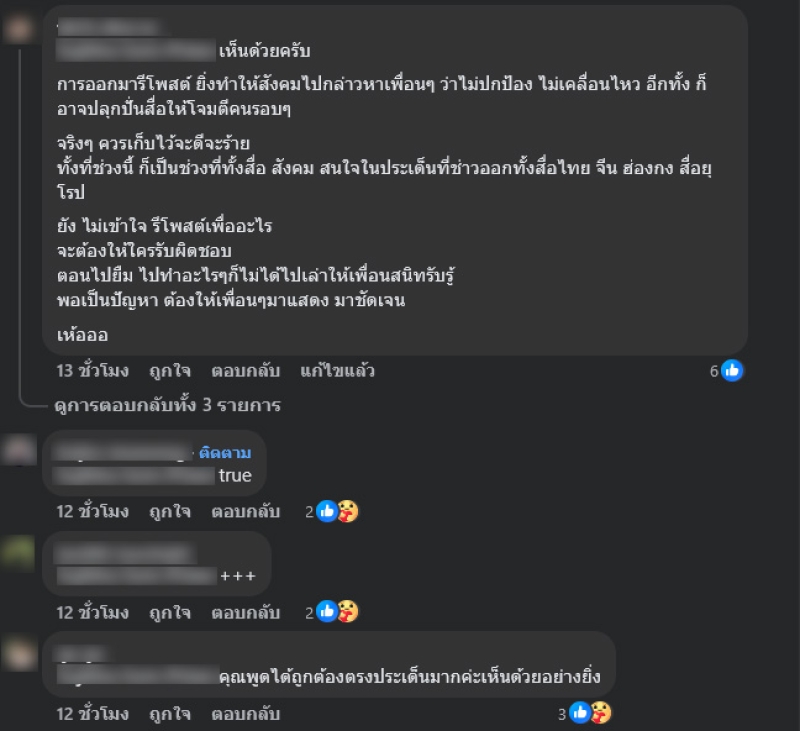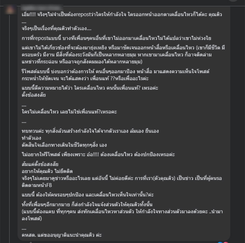 รีโพสต์แบบนี้ บ่งบอกว่าต้องการให้ คนอื่นๆออกมาป้อง หน้าสื่อ มาแสดงความเห็นใจโพสต์กระหน่ำให้ชัดเจน จะได้แสดงว่า เพื่อนแท้ ??หรือเพื่ออะไรคะ แบบนี้ตีความหมายได้ว่า ใครเคลื่อนไหว คนนั้นเพื่อนแท้? เหรอค่ะ ตั้งข้อสงสัย ใครไม่เคลื่อนไหว เลยไม่ใช่เพื่อนแท้?เหรอคะ ทบทวนค่ะ ทุกสิ่งล้วนสร้างกำลังใจได้จากตัวเราเอง ล้มเอง ยืนเองทำตัวเอง ตัดสินใจเลือกทางเดินในชีวิตทุกๆสิ่ง เอง