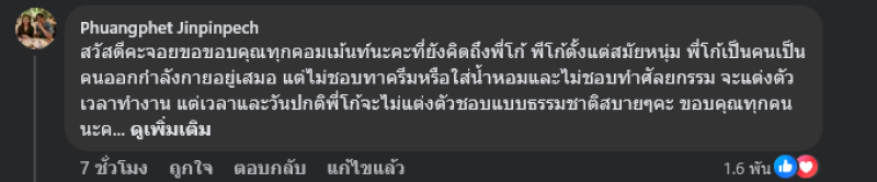 จะแต่งตัวเวลาทำงาน แต่เวลาและวันปกติพี่โก้จะไม่แต่งตัวชอบแบบธรรมชาติสบายๆคะ ขอบคุณทุกคนนะคะที่รักและเป็นห่วงใยครอบครัวจินปิ่นเพ็ชร พวกเราอยู่สบายดีมีสุขภาพจิตที่ดีและมีสุขภาพกายแข็งแรงทุกคน ส่วนหน้าตาพี่โก้จะไม่เสริมเติมแต่งอะไรคะปล่อยตามแบบธรรมชาติและตามวัยนะคะ ขอแค่สุขภาพจิตดีสุขภาพกายพร้อมเราก็ดีใจแล้วคะ รักทุกคนและขอบคุณที่คอมเม้นท์ทักทายกันด้วยความคิดถึงนะคะ