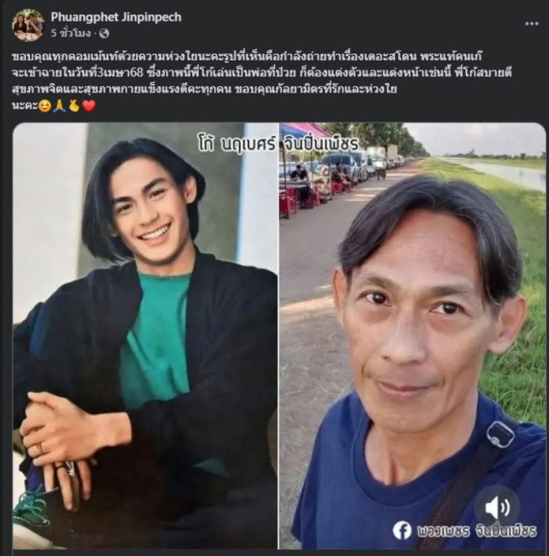 ต่อมาแชร์ภาพของสามี และบอกว่า ขอบคุณทุกคอมเม้นท์ด้วยความห่วงใยนะคะ รูปที่เห็นคือกำลังถ่ายทำเรื่องเดอะสโตน พระแท้คนเก๊ จะเข้าฉายในวันที่3เมษา68 ซึ่งภาพนี้พี่โก้เล่นเป็นพ่อที่ป่วย ก็ต้องแต่งตัวและแต่งหน้าเช่นนี้ พี่โก้สบายดีสุขภาพจิตและสุขภาพกายแข็งแรงดีคะทุกคน ขอบคุณกัลยามิตรที่รักและห่วงใยนะคะ