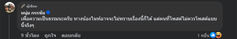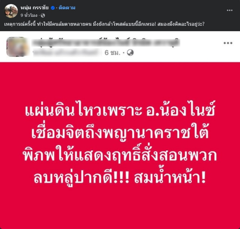 โดยระบุว่า เหตุการณ์ครั้งนี้ ทำให้มีคนล้มตายหลายคน xึงยังกล้าโพสต์แบบนี้อีกเหรอ! สมองxึงคิดอะไรอยู่ว่ะ? ทั้งนี้ข้อความดังกล่าวคือ แผ่นดินไหวเพราะ อ.น้องไนซ์ เชื่อมจิตถึงพญานาคราชใต้พิภพให้แสดงฤทธิ์สั่งสอนพวกลบหลู่ปากดี!! สมน้ำหน้า!