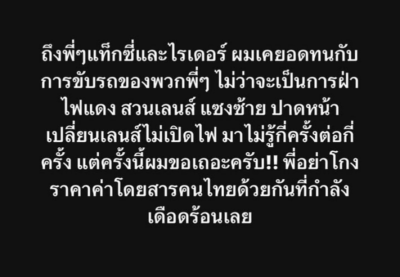 พร้อมเขียนว่า ถึงพี่ๆแท็กซี่และไรเดอร์ ผมเคยอดทนกับการขับรถของพวกพี่ๆ ไม่ว่าจะเป็นการฝ่าไฟแดง สวนเลนส์ แซงซ้าย ปาดหน้าเปลี่ยนเลนส์ไม่เปิดไฟ มาไม่รู้กี่ครั้งต่อกี่ครั้ง แต่ครั้งนี้ผมขอเถอะครับ!! พี่อย่าโกงราคาค่าโดยสารคนไทยด้วยกันที่กำลังเดือดร้อนเลย
