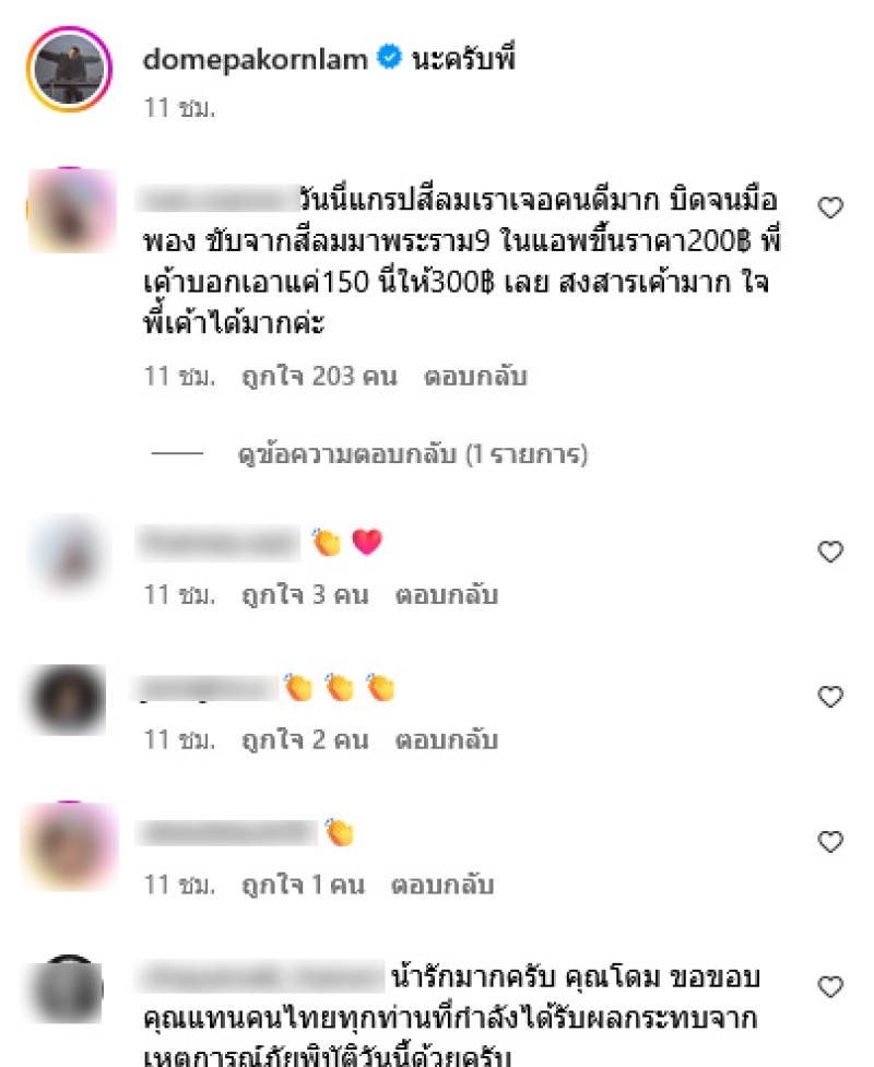 เรียกได้ว่าเป็นอีกหนึ่งนักร้องและพระเอกหนุ่มสำหรับ โดม ปกรณ์ ลัม ที่ล่าสุดได้ออกมาเคลื่อนไหวหลังจากเหตุการณ์แผ่นดินไหวที่ประเทศเมียนมา กระทบพื้นที่กรุงเทพมหานคร ประเทศไทย ทั้งนี้ โดม ได้โพสต์ฝากถึงแท็กซี่-ไรเดอร์ ผ่านทางอินสตาแกรม domepakornlam