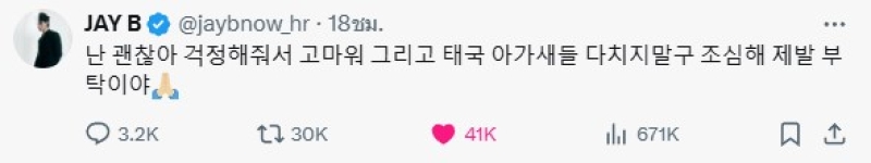 โดยหลังจากที่เกิดเหตุการณ์ดังกล่าวนี้ เมื่อช่วงบ่ายของเมื่อวาน ด้านหนุ่มเจบี สมาชิกวงบอยแบนด์ GOT7 ได้ออกมาเคลื่อนไหวผ่านแพลตฟอร์ม X ว่า ตอนนี้ตนปลอดภัยดีแล้ว พร้อมขอบคุณความห่วงใยจากแฟนๆ และขอให้ทุกคนโปรดระมัดระวังตัว ไม่ให้ได้รับบาดเจ็บจากเหตุการณ์ดังกล่าว พร้อมกล่าวเสริมว่า ผมสบายดี ขอบคุณที่เป็นห่วงและขอร้องสาวไทย โปรดอย่าได้รับบาดเจ็บและระมัดระวังตัวเองกันด้วย ขอร้องล่ะ