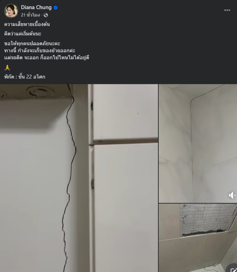 ผ่านทางเฟซบุ๊คส่วนตัวระบุว่า เห้ยคอนโด กำเเพง ร้าว ความเสียหายเบื้องต้นคิดว่าแค่เริ่มต้นนะ ขอให้ทุกคนปลอดภัยนะคะ ทางนี้ กำลังจะเก็บของย้ายออกค่ะ เเต่รถติด จะออก ก็ออกไปไหนไม่ได้อยู่ดี พิกัด : ชั้น 22 อโศก ตอนนี้ออกมาอยู่บ้านเเล้วนะคะ ... ขอรอดูสถานการณ์ก่อนค่ะ เเม้จะมีการเเจ้งจากนิติว่าโครงสร้างปลอดภัย เเต่ กระเบืัองร่อน หล่น ฝ้าชำรุด เเละใดๆ ขอดูก่อน ขอบคุณทุกท่านที่เป็นห่วงค่ะ ชาวคอนโดคืนนี้น่าจะตุ้มๆต่อมๆ สู้ค่ะ!