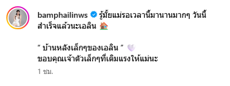 พร้อมเขียนแคปชั่นว่า รู้มั้ยแม่รอเวลานี้มานานมากๆ วันนี้สำเร็จแล้วนะเอลิน บ้านหลังเล็กๆของเอลิน ขอบคุณเจ้าตัวเล็กๆที่เติมแรงให้แม่นะ ท่ามกลางแฟนๆต่างเข้ามาคอมเมนต์แสดงความยินดีกันอย่างมาก