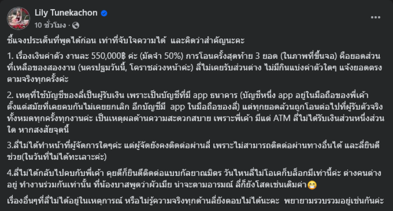 ล่าสุดทางด้าน ลิลลี่ ได้ออกมาชี้แจงผ่านทางเฟซบุ๊ค Lily Tunekachon ระบุว่า ชี้แจงประเด็นที่พูดได้ก่อน เท่าที่จับใจความได้ และคิดว่าสำคัญนะคะ