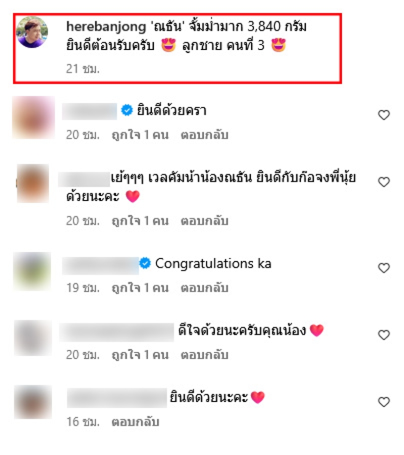 โดยตั้งชื่อว่า น้อง ณธัน ซึ่งทางด้านคุณพ่อได้เผยภาพผ่านทางอินสตาแกรม herebanjong พร้อมเขียนแคปชั่นว่า ณธัน จ้ำม่ำมาก 3,840 กรัม ยินดีต้อนรับครับ ลูกชาย คนที่ 3 ท่ามกลางแฟนๆเเละคนในวงการต่างร่วมแสดงความยินดี