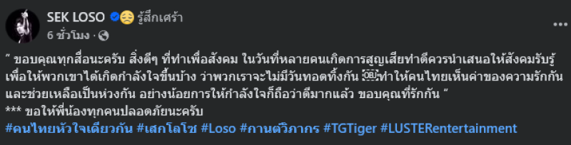 หลังจากที่ลงพื้นที่ให้กำลังใจ โดยระบุว่า ขอบคุณทุกสื่อนะครับ สิ่งดีๆ ที่ทำเพื่อสังคม ในวันที่หลายคนเกิดการสูญเสียทำดีควรนำเสนอให้สังคมรับรู้ เพื่อให้พวกเขาได้เกิดกำลังใจขึ้นบ้าง ว่าพวกเราจะไม่มีวันทอดทิ้งกัน ทำให้คนไทยเห็นค่าของความรักกันและช่วยเหลือเป็นห่วงกัน อย่างน้อยการให้กำลังใจก็ถือว่าดีมากแล้ว ขอบคุณที่รักกัน*** ขอให้พี่น้องทุกคนปลอดภัยนะครับ