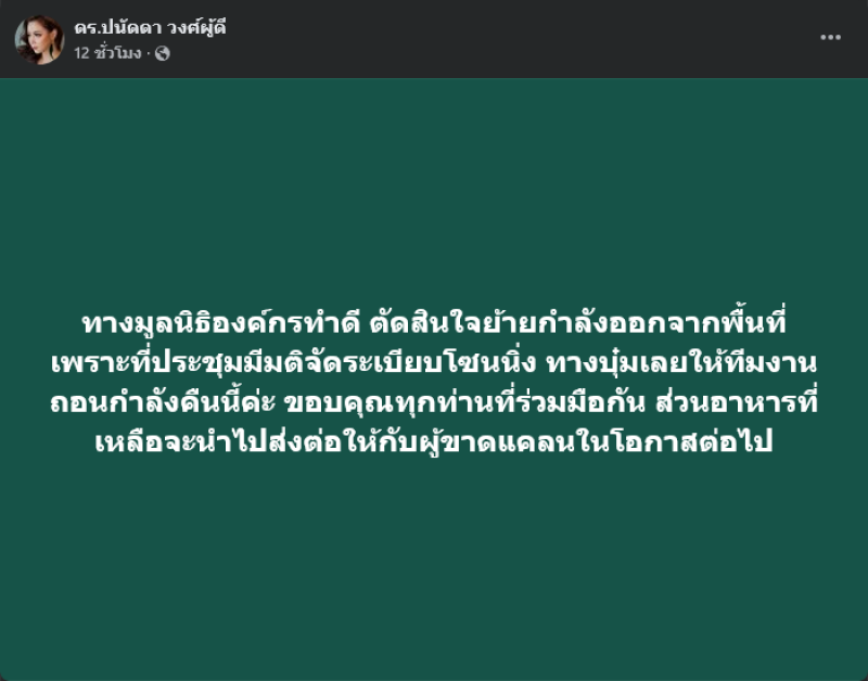 ทางมูลนิธิองค์กรทำดี ตัดสินใจย้ายกำลังออกจากพื้นที่ เพราะที่ประชุมมีมติจัดระเบียบโซนนิ่ง ทางบุ๋มเลยให้ทีมงานถอนกำลังคืนนี้ค่ะ ขอบคุณทุกท่านที่ร่วมมือกัน ส่วนอาหารที่เหลือจะนำไปส่งต่อให้กับผู้ขาดแคลนในโอกาสต่อไป
