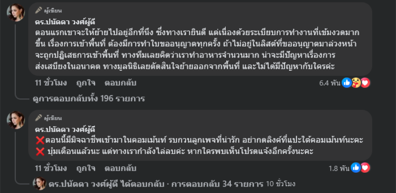 ตอนแรกเขาจะให้ย้ายไปอยู่อีกที่นึง ซึ่งทางเรายินดี แต่เนื่องด้วยระเบียบการทำงานที่เข้มงวดมากขึ้น เรื่องการเข้าพื้นที่ ต้องมีการทำใบขออนุญาตทุกครั้ง ถ้าไม่อยู่ในลิสต์ที่ขออนุญาตมาล่วงหน้า จะถูกปฏิเสธการเข้าพื้นที่ ทางทีมเลยคิดว่าเราทำอาหารจำนวนมาก น่าจะมีปัญหาเรื่องการส่งเสบียงในอนาคต ทางมูลนิธิเลยตัดสินใจย้ายออกจากพื้นที่ และไม่ได้มีปัญหากับใครค่ะ