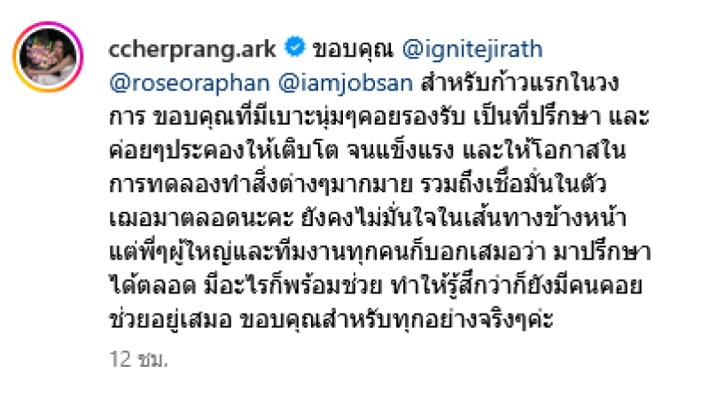 ขอบคุณ สำหรับก้าวแรกในวงการ ขอบคุณที่มีเบาะนุ่มๆ คอยรองรับ เป็นที่ปรึกษา และค่อยๆประคองให้เติบโต จนแข็งแรง และให้โอกาสในการทดลองทำสิ่งต่างๆมากมาย รวมถึงเชื่อมั่นในตัวเฌอมาตลอดนะคะ ยังคงไม่มั่นใจในเส้นทางข้างหน้า แต่พี่ๆ ผู้ใหญ่และทีมงานทุกคนก็บอกเสมอว่า มาปรึกษาได้ตลอด มีอะไรก็พร้อมช่วย ทำให้รู้สึกว่าก็ยังมีคนคอยช่วยอยู่เสมอ ขอบคุณสำหรับทุกอย่างจริงๆค่ะ