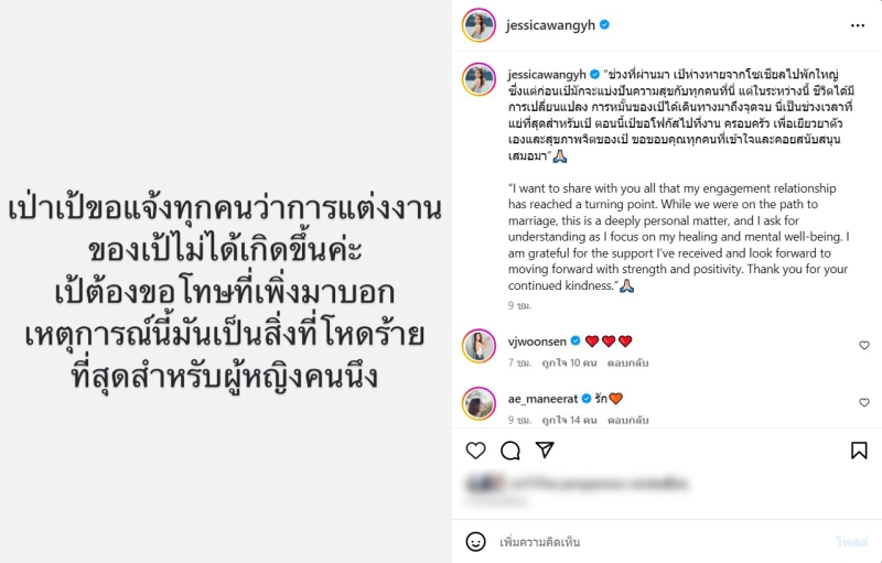 และได้โพสต์ข้อความอีกว่า ช่วงที่ผ่านมา เป้ห่างหายจากโซเชียลไปพักใหญ่ ซึ่งแต่ก่อนเป้มักจะแบ่งปันความสุขกับทุกคนที่นี่ แต่ในระหว่างนี้ ชีวิตได้มีการเปลี่ยนแปลง การหมั้นของเป้ได้เดินทางมาถึงจุดจบ นี่เป็นช่วงเวลาที่แย่ที่สุดสำหรับเป้ ตอนนี้เป้ขอโฟกัสไปที่งาน ครอบครัว เพื่อเยียวยาตัวเองและสุขภาพจิตของเป้ ขอขอบคุณทุกคนที่เข้าใจและคอยสนับสนุนเสมอมา