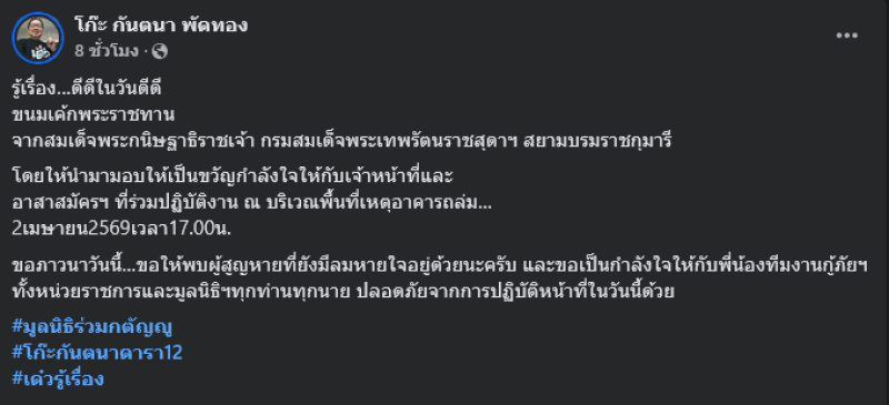 ทั้งนี้ โก๊ะ กันตนา กู้ภัยดาราจากร่วมกตัญญูโพสต์เฟซบุ๊ค โก๊ะ กันตนา พัดทอง ว่า รู้เรื่อง ดีดีในวันดีดี ขนมเค้กพระราชทาน จากสมเด็จพระกนิษฐาธิราชเจ้า กรมสมเด็จพระเทพรัตนราชสุดาฯ สยามบรมราชกุมารี โดยให้นำมามอบให้เป็นขวัญกำลังใจให้กับเจ้าหน้าที่และ อาสาสมัครฯ ที่ร่วมปฏิบัติงาน ณ บริเวณพื้นที่เหตุอาคารถล่ม 2เมษายน2569เวลา17.00น.