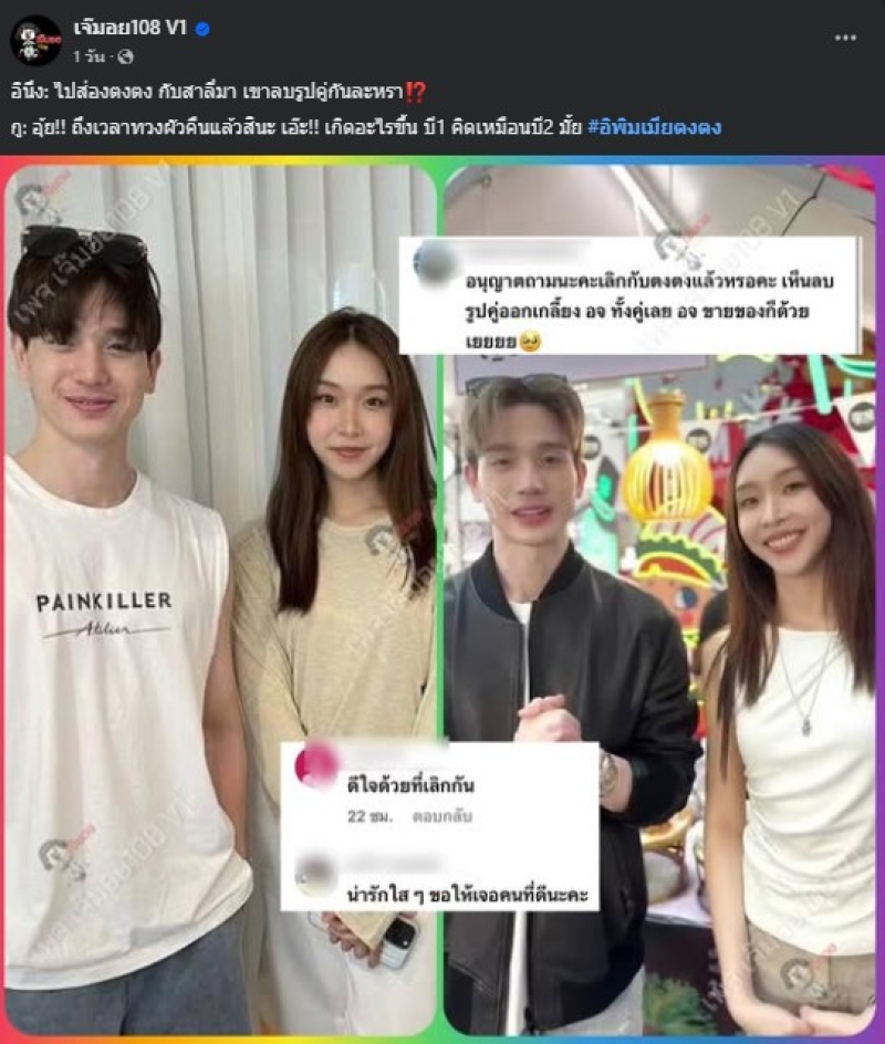 แต่ทว่า ล่าสุด ด้านเพจดัง อย่างเพจเจ๊มอย 108 V1 ได้ออกมาโพสต์รูปของสาวสาลี่กับหนุ่มตงตง เนื่องจากมีชาวเน็ตรายหนึ่ง ได้ออกมาคอมเมนต์ตั้งข้อสังเกตทั้งคู่ ดังนี้ว่า ขออนุญาตถามนะคะ เลิกกับตงตงแล้วหรอคะ เห็นลบรูปคู่ออกเกลี้ยง ไอจีทั้งคู่เลย ไอจีขายของก็ด้วย โดยด้านเพจเจ๊มอย ก็ได้ใส่แคปชั่นหัวข้อดังกล่าวว่า ไปส่องตงตงกับสาลี่มา เขาลบรูปคู่กันแล้วหรอ งานนี้ทำเอาเหล่าชาวเน็ตต่างพากันไปขุดหาความจริง พร้อมแสดงความคิดเห็นกันไปหลายทิศทาง แต่งานนี้ยังไม่มีคำตอบที่ชัดเจน อย่างไรก็ตาม โปรดติดตามฟังความจริงจากทั้งคู่ว่าเรื่องราวเป็นอย่างไรไปพร้อมกันได้เลยค่ะ