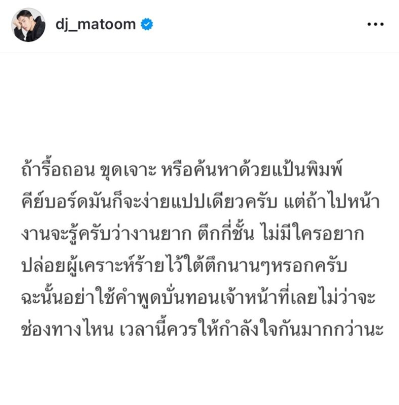 แต่ทว่า ก็ไม่วายที่ด้านคอมเมนต์จากชาวเน็ตได้พากันออกมาติติง ถึงเรื่องการทำงานของเจ้าหน้าที่กันอย่างไม่ขาดสาย ทำเอาด้านพิธีกรคนเก่ง อย่าง ดีเจ มะตูม ถึงกับอดไม่ไหว รุดออกมาเคลื่อนไหวผ่านโซเชียล พร้อมโพสต์เตือนชาวเน็ตบางกลุ่ม ที่กำลังพูดจาบั่นทอนเจ้าหน้าที่ พร้อมมองว่า ควรให้กำลังใจ เพราะในหน้างานจริงๆแล้วมันอาจมีอุปสรรคที่อาจทำให้ในการค้นหายากกว่าที่คิดก็เป็นได้ ก่อนกล่าวปิดท้าย ด้วยการส่งกำลังใจให้กับเจ้าหน้าที่ทุกหน่วยงานที่กู้ซากตึกหน้างานทุกคน