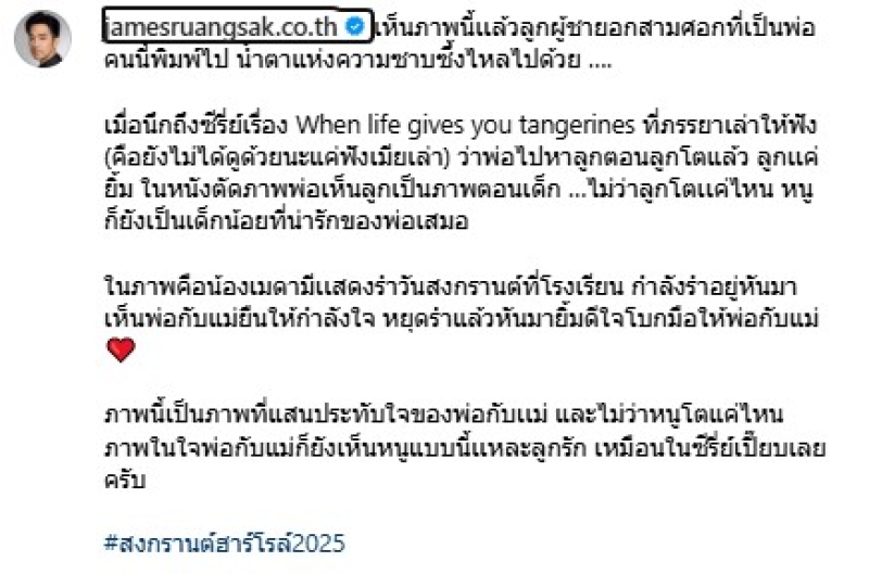 โดยล่าสุด ด้านหนุ่มเจมส์ ได้มีโอกาสไปดูการแสดงสดของ น้องเมดา ลูกสาวสุดที่รัก พร้อมเขียนเล่าความประทับใจ ผ่านแคปชั่น ดังนี้ว่า ระหว่างลูกสาวกำลังรำอยู่ จังหวะเดียวกันที่หันไปทางด้านพ่อเจมส์กับครูก้อยที่ยืนให้กำลังใจลูกสาว ก็มีซีนที่ทำให้คุณพ่ออย่างหนุ่มเจมส์ถึงกับเกิดอาการน้ำตาซึมร้องไห้ออกมาระหว่างกำลังพิมพ์แคปชั่นว่า นึกถึงซีรีส์ When life gives you tangerines พร้อมเผยว่า แม้ตนยังไม่ได้ดูแต่ฟังจากที่ภรรยาเล่า ก็ได้แต่นึกภาพพร้อมยิ้มหนังว่า ตัดภาพพ่อเห็นลูกเป็นภาพตอนเด็ก ไม่ว่าลูกจะโตแค่ไหน หนูก็ยังเป็นเด็กน้อยที่น่ารักของพ่อเสมอ