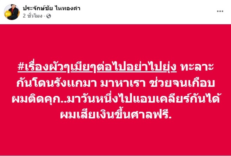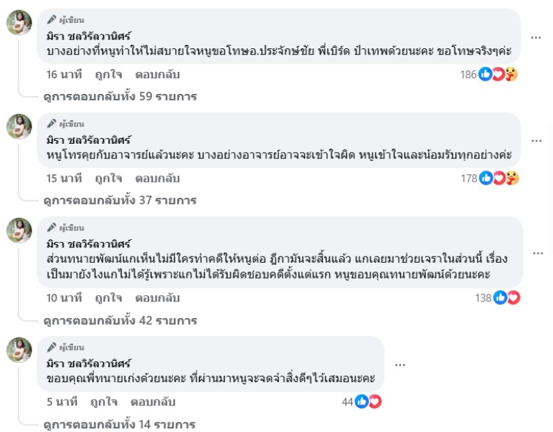 จากกรณที่ก่อนหน้านั้น ทางนายห้าง ประจักษ์ชัย ไหทองคำ ได้ออกมาโพสต์ว่า อย่างน้อยๆเอ๋ มิรา กับแม่ควรปรึกษา บอกอะไรผมด้วยจะทำอะไร อย่างน้อยผมก็เคยช่วยเหลือ ปกป้องคุณ ขึ้นศาลเพราะคุณ7ครั้งเกือบติดคุกเสียเงิน โดนปรับเกือบ2ล้าน …บ่เป็นหยังผมอภัยให้ กลืนเลือดและน้ำตา ยอมกินอาหารหมาเอง