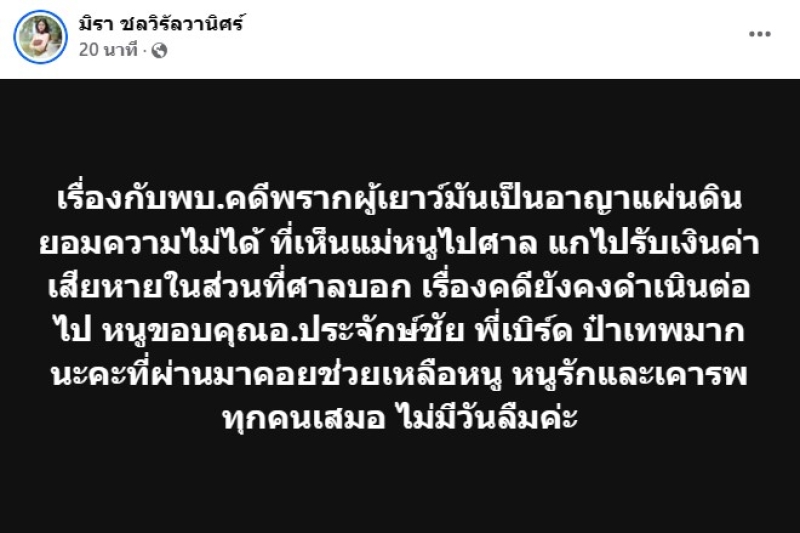 ล่าสุด ทาง เอ๋ มิรา ชลวิรัลวานิศร์ ได้ออกมาโพสต์แล้วว่า เรื่องกับพบ.คดีพรากผู้เยาว์มันเป็นอาญาแผ่นดินยอมความไม่ได้ ที่เห็นแม่หนูไปศาล แกไปรับเงินค่าเสียหายในส่วนที่ศาลบอก เรื่องคดียังคงดำเนินต่อไป หนูขอบคุณอ.ประจักษ์ชัย พี่เบิร์ด ป๋าเทพมากนะคะที่ผ่านมาคอยช่วยเหลือหนู หนูรักและเคารพทุกคนเสมอ ไม่มีวันลืมค่ะ