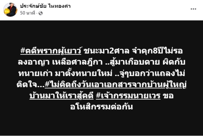 ส่วนทนายพัฒน์แกเห็นไม่มีใครทำคดีให้หนูต่อ ฎีกามันจะสิ้นแล้ว แกเลยมาช่วยเจราในส่วนนี้ เรื่องเป็นมายังไงแกไม่ได้รู้เพราะแกไม่ได้รับผิดชอบคดีตั้งแต่แรก หนูขอบคุณทนายพัฒน์ด้วยนะคะ