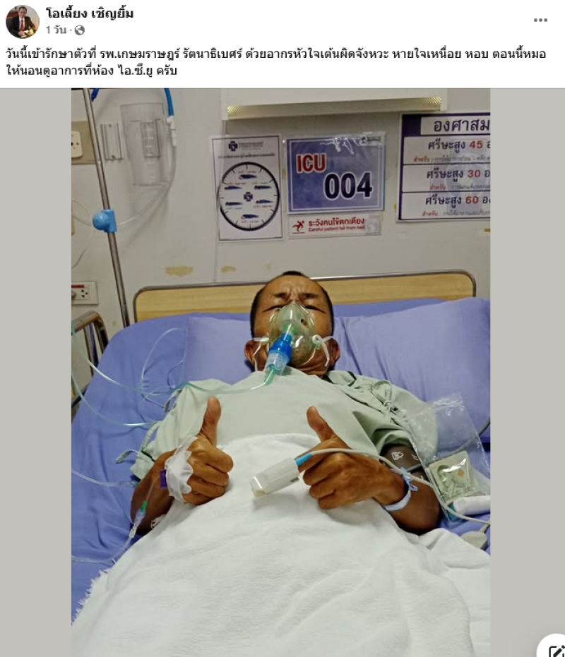 วันนี้เข้ารักษาตัวที่ รพ.เกษมราษฎร์ รัตนาธิเบศร์ ด้วยอากรหัวใจเต้นผิดจังหวะ หายใจเหนื่อย หอบ ตอนนี้หมอให้นอนดูอาการที่ห้อง ไอ.ซี.ยู ครับ ท่ามกลางแฟนๆต่างเข้ามาคอมเมนต์ให้กำลังใจกันอย่างมาก อาทิ หายไวๆนะคะป๋า,เป็นกำลังใจให้นะครับ,หายไวไวนะคะพี่ บุญรักษาค่ะ,สุขภาพแข็งแรงๆหายไวๆนะครับ เป็นต้น