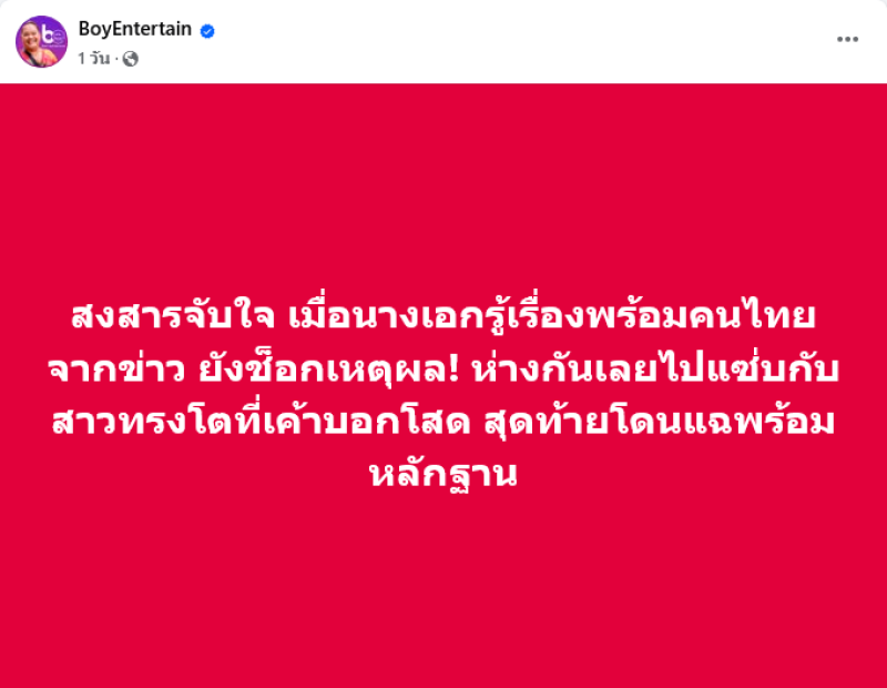 จากกรณีข่าวเมาท์สนั่นโซเชียลของพระเอกหนุ่มที่ร้องเพลงได้ แอบนอกใจแฟนสวยแบ๊ว พร้อมทั้งมีหลักฐานเด็ดเป็นภาพจากกล้องหน้ารถ รวมถึงคลิปเสียงที่ถูกปล่อยออกมาอย่างต่อเนื่อง ล่าสุดทางด้านพิธีกรชื่อดังอย่าง บอย เอนเตอร์เทน ได้ออกมาเคลื่อนไหวถึงประเด็นดังกล่าวผ่านทางเฟซบุ๊ค BoyEntertain ระบุว่า