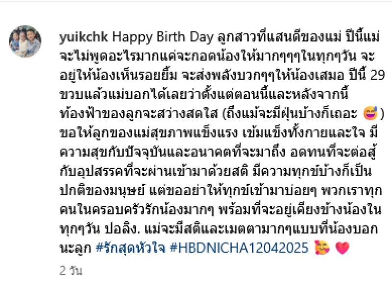 แต่ขออย่าให้ทุกข์เข้ามาบ่อยๆ พวกเราทุกคนในครอบครัวรักน้องมากๆ พร้อมที่จะอยู่เคียงข้างน้องในทุกๆ วัน ปอลิง. แม่จะมีสติและเมตตามากๆ แบบที่น้องบอกนะลูก #รักสุดหัวใจ #HBDNICHA12042025 ทั้งนี้ในอินสตาแกรมของคุณแม่พบว่า ได้อันฟอลโลว์โตโน่ไปแล้ว พร้อมทั้งลบภาพโตโน่ออกไปหลายภาพเลยทีเดียว