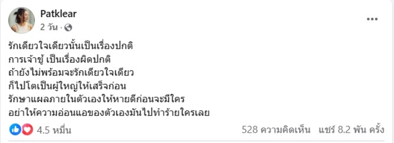 เรียกได้ว่า เป็นเรื่อราวมที่คนในวงการพุดถึงอีกครั้ง เกี่ยวกับประเด็นการนอกใจ ล่าสุด นักร้องสาวเสียงดีอย่าง แพท วงเคลียร์ ก็ได้ออกมาโพสต์ว่า รักเดียวใจเดียวนั้นเป็นเรื่องปกติ การเจ้าชู้ เป็นเรื่องผิดปกติ ถ้ายังไม่พร้อมจะรักเดียวใจเดียว ก็ไปโตเป็นผู้ใหญ่ให้เสร็จก่อน รักษาแผลภายในตัวเองให้หายดีก่อนจะมีใคร อย่าให้ความอ่อนแอของตัวเองมันไปทำร้ายใครเลย