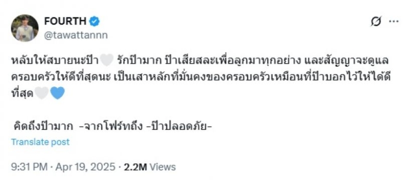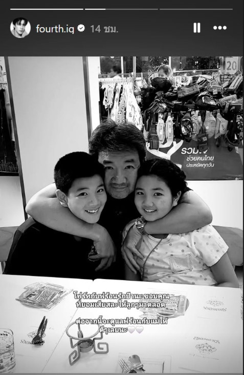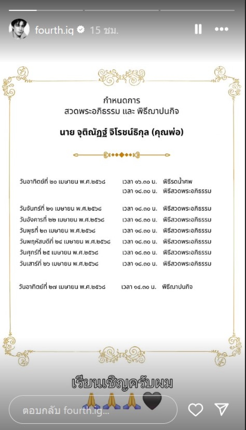 และได้โพสต์ลงสตอรี่ไอจี เป็นกำหนดพิธีต่างๆ พร้อมข้อความระบุว่า เรียนเชิญครับผม นอกจากนี้ โพสต์ภาพวัยเด็ก ร่วมเฟรมคุณพ่อ พร้อมข้อความระบุว่า โฟร์ทกับฟร้อนรักป๊านะ ขอบคุณที่ยอมเสียสละให้ลูกๆมาตลอด ต่อจากนี้จะดูฟร้อนกับแม่ให้ดีๆเลยนะ