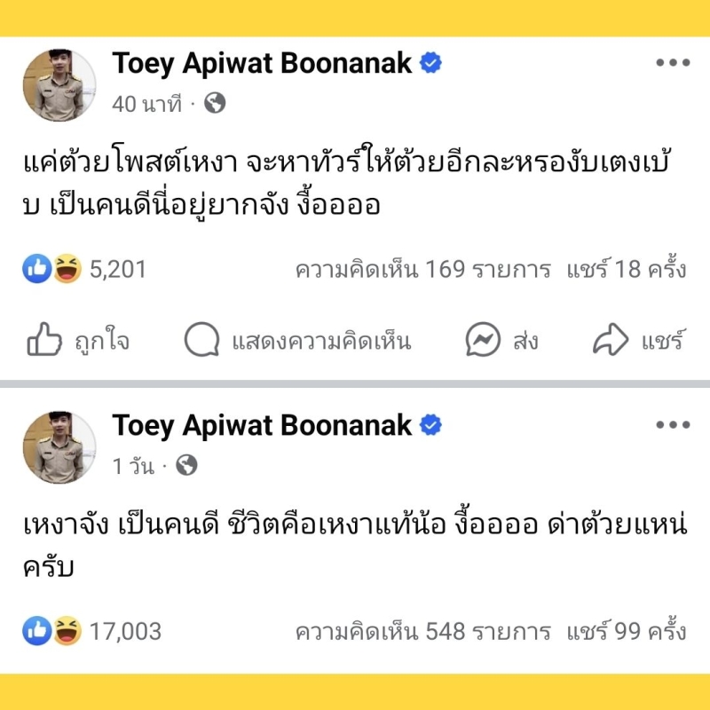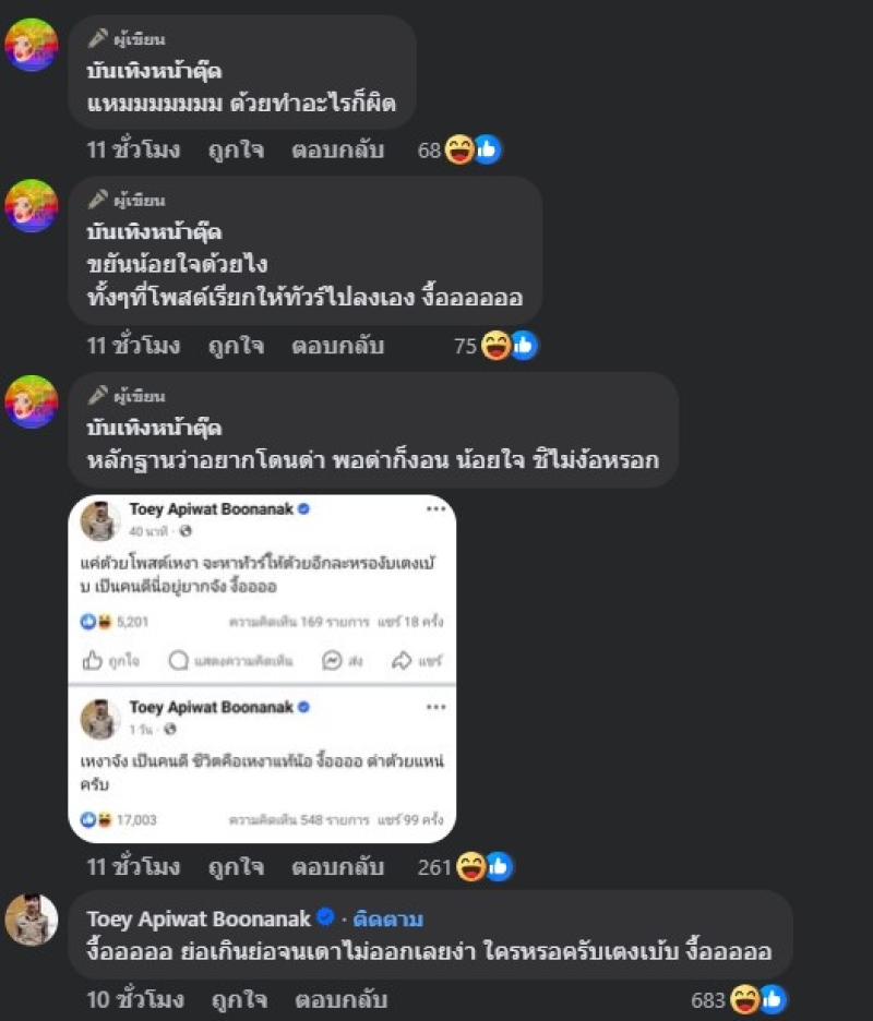 บางวันเขาเหนื่อย เขาเซ็ง ไม่มีอะไรทำก็โพสต์งอนทำอะไรก็โดนทัวร์ลง ทำอะไรก็ผิด ชื่อย่อ ครูต้วย พร้อมอิโมจิเบะปากมองบน ก่อนที่ในเวลาต่อมา ด้านครูเต้ย อภิวัฒน์ ที่ได้เห็นข้อความดังกล่าวก็รีบออกมาตอบกลับทันทีเลยว่างื้อ ย่อเกินย่อจนเดาไม่ออกเลยง่า ใครหรอครับเตงเบ้บ งื้อ งานนี้ทำเอาเหล่าชาวเน็ตต่างพากันเข้ามาคอมเมนต์กันยกใหญ่ ในทำนองว่า โพสต์ให้คนด่า พอคนไปด่าก็น้อยใจตัดพ้อ ครูต้วยหนอครูต้วย บ้างก็บอกว่า ในไลน์คุยอยู่ร้อยคนเอาหยังมาเหงา เป็นต้น