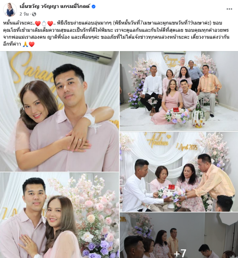 ขอบคุณโยที่เข้ามาเติมเต็มความสุขและเป็นรักที่ดีให้พิมนะ เราจะดูแลกันและกันให้ดีที่สุดเลย ขอบคุณทุกคำอวยพรจากพ่อแม่เราสองคน ญาติพี่น้อง และเพื่อนๆ ค่ะ ขออภัยที่ไม่ได้แจ้งข่าวทุกคนล่วงหน้านะคะ เดี๋ยวงานแต่งว่ากันอีกทีค่า