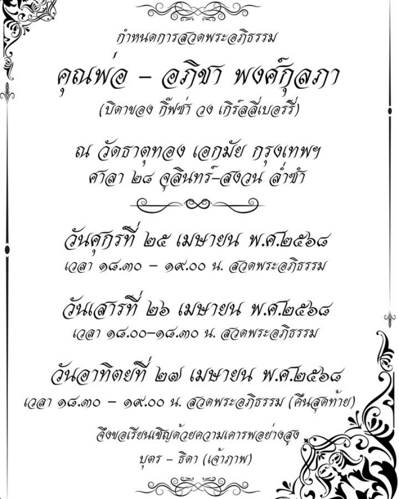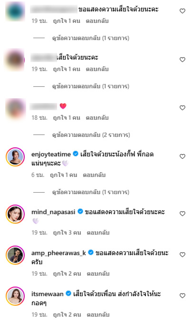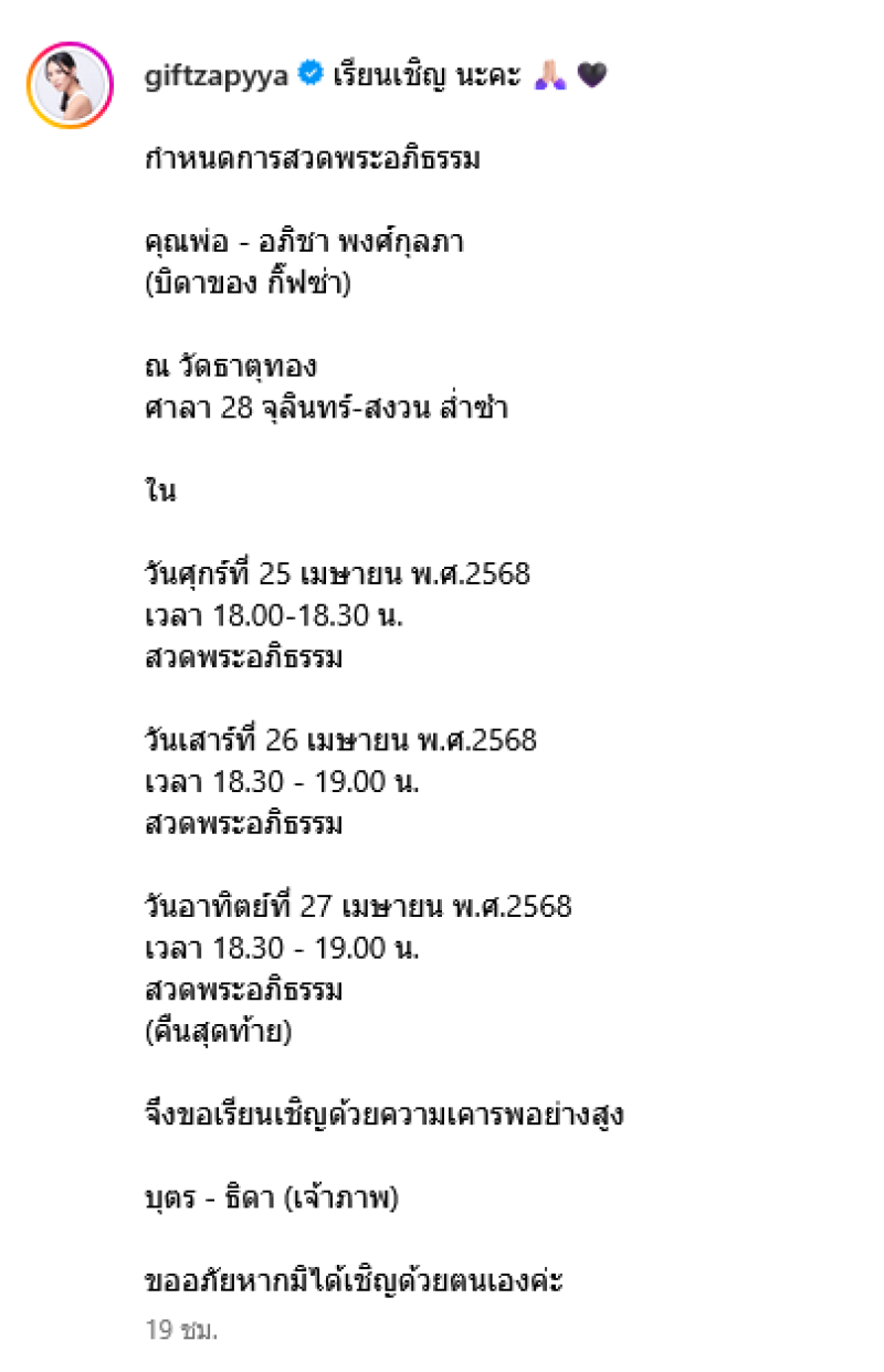 โดยเผยภาพกำหนดการสวดพระอภิธรรม ท่ามกลางคนบันเทิงและแฟนคลับ ร่วมแสดงความเสียใจ อาลัยการจากไปของคุณพ่อ กันอย่างมาก อาทิ ขอแสดงความเสียใจด้วยนะคะ,เสียใจด้วยนะน้องกิ๊ฟ พี่กอดแน่นๆนะคะ,เสียใจด้วยเพื่อน ส่งกำลังใจให้นะ กอดๆ,น้องขอแสดงความเสียใจด้วยนะคะ เป็นต้น