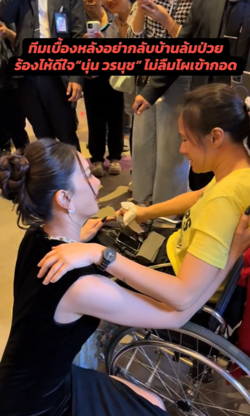 ทันทีที่เห็น นุ่น ได้รีบกุมมือ นั่งลงข้างๆ และสวมกอดอย่างจริงใจ ทำเอาอีกฝ่ายน้ำตาไหล เพราะไม่คิดว่านุ่น วรนุช จะยังจำได้และใส่ใจขนาดนี้ ทำเอาคนที่เห็นในงานต่างทราบซึ้งโมเมนต์น่ารักอบอุ่นที่มีต่อทีมงานอย่างมาก
