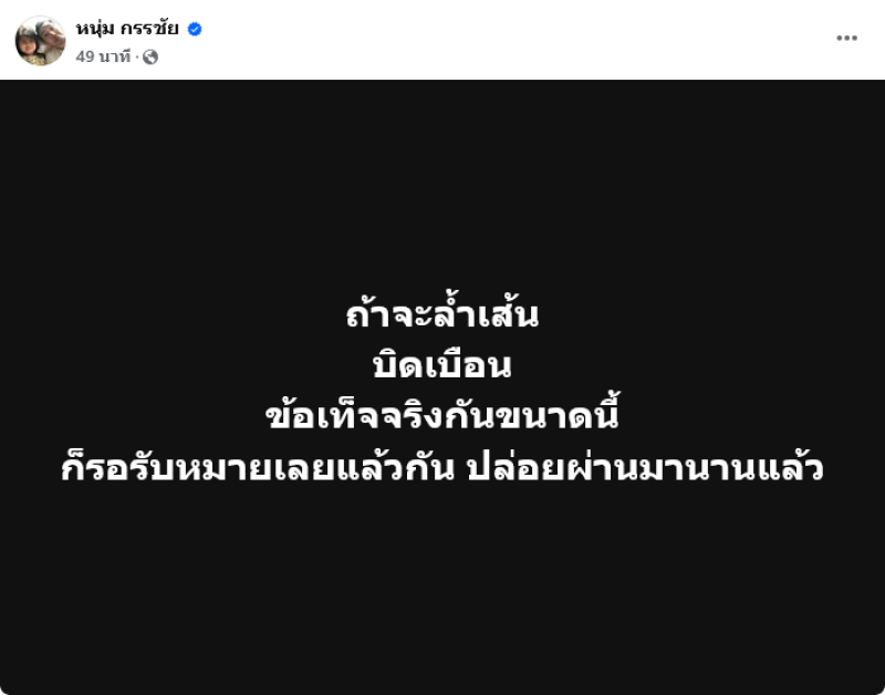 เรียกได้ว่าเป็นอีกหนึ่งพิธีกรชื่อดังสำหรับ หนุ่ม กรรชัย กำเนิดพลอย ที่ล่าสุดได้ออกมาเคลื่อนไหวผ่านทางเฟซบุ๊คแบบเดือดๆ หนุ่ม กรรชัย โดยระบุว่า ถ้าจะล้ำเส้น บิดเบือนข้อเท็จจริงกันขนาดนี้ ก็รอรับหมายเลยแล้วกัน ปล่อยผ่านมานานแล้ว,คลิปเสียงคนกลางที่เป็นหลักฐานพร้อม พยานรับทราบเหตุการณ์พร้อม ข้อความบิดเบือนนำเข้าสู่ระบบพร้อม