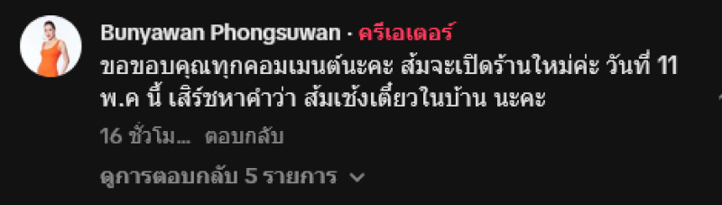 แต่ว่าตอนนี้เขาต้องการที่คืนแล้ว มาเป็นกำลังใจให้ด้วย พฤษภาคม ย้ายร้านแล้ว ปิดวันที่ 11 พฤษภาคม เป็นต้นไป ทั้งนี้ ส้มเช้ง บอกด้วยว่า ขอขอบคุณทุกคอมเมนต์นะคะ ส้มจะเปิดร้านใหม่ค่ะ วันที่ 11 พ.ค นี้ เสิร์ชหาคำว่า ส้มเช้งเตี๋ยวในบ้าน นะคะ
