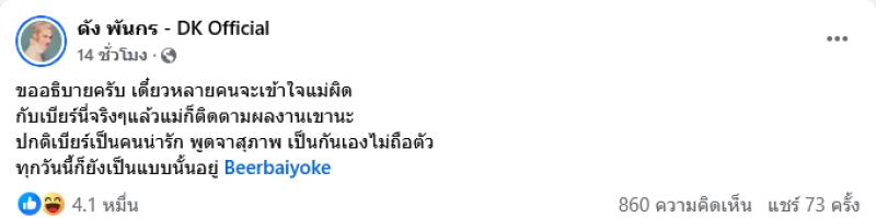 ขออธิบายครับ เดี๋ยวหลายคนจะเข้าใจแม่ผิด กับเบียร์นี่จริงๆแล้วแม่ก็ติดตามผลงานเขานะ ปกติเบียร์เป็นคนน่ารัก พูดจาสุภาพ เป็นกันเองไม่ถือตัว ทุกวันนี้ก็ยังเป็นแบบนั้นอยู่ Beerbaiyoke ท่ามกลางชาวเน็ตต่างเข้ามาคอมเมนต์กันอย่างมาก