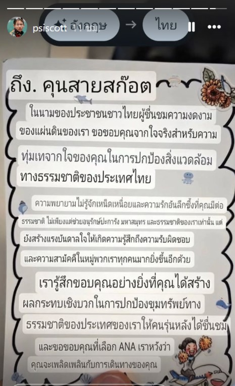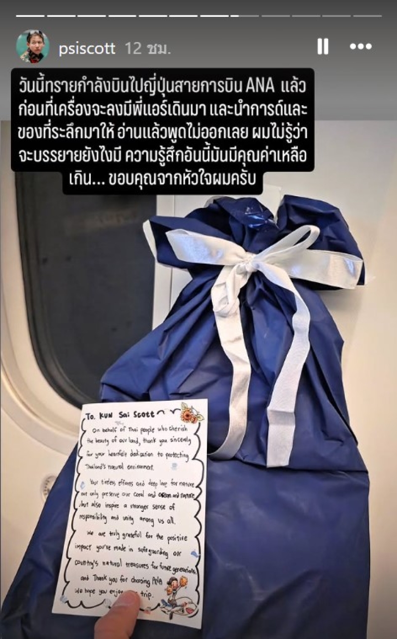 ล่าสุด ทางคุณทรายได้ออกมาเผยเรื่องราวที่ทำเอาใจฟู เมื่อทราย ได้อัพสตอรี่ใน ig กำลังบินไปญี่ปุ่นด้วยสายการบิน ANA ก่อนลงเครื่องมีแอร์นำการ์ดและของที่ระลึกมาให้ เผยข้อความถึง ทราย สก๊อต พูดไม่ออก ไม่รู้จะบรรยายยังไง โดยมีข้อความว่า ถึง คุณ ทราย สก๊อต