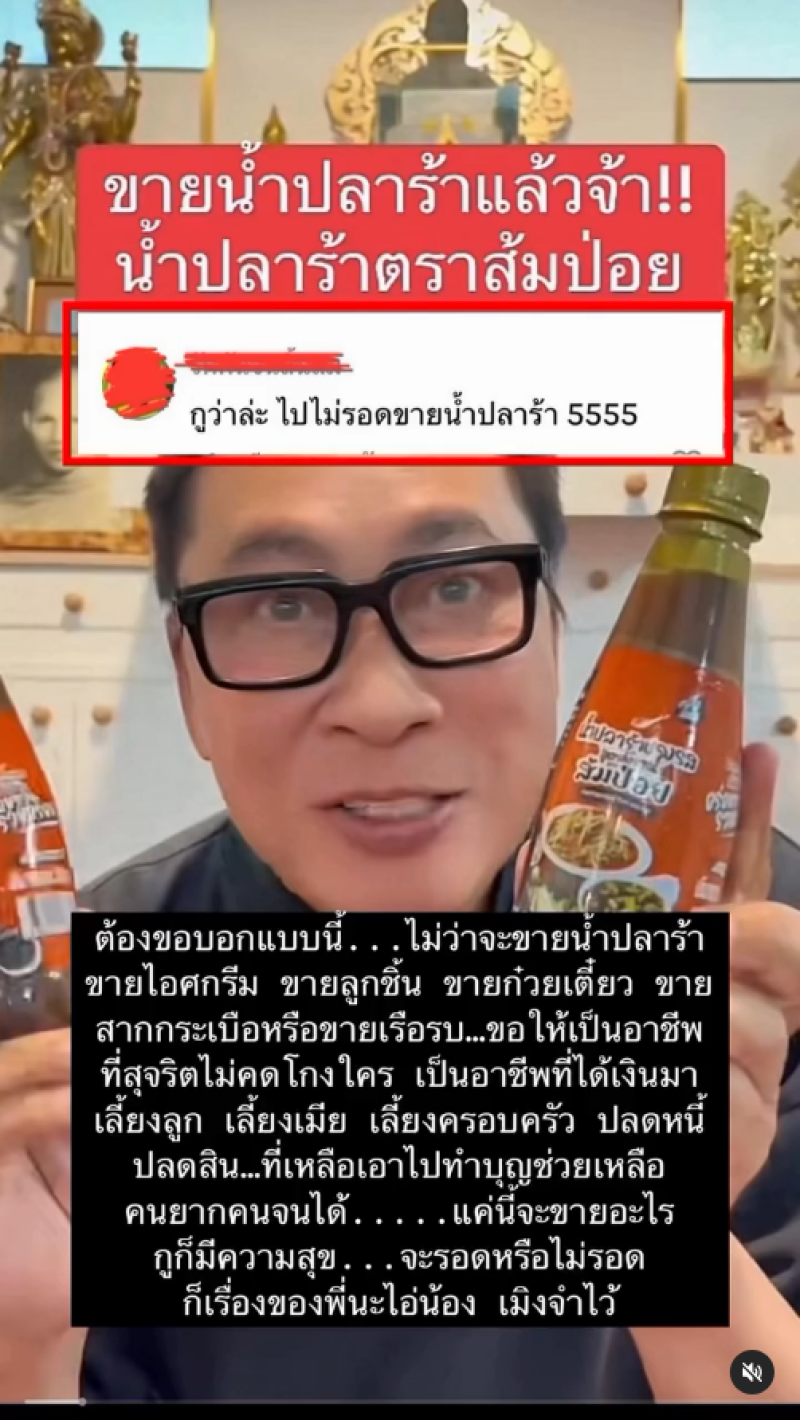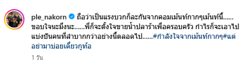 แบ่งปันคนที่ลำบากกว่าอย่างนี้ตลอดไป #กำลังใจจากเมนต์กากๆ #แต่อย่ามาบ่อยเดี๋ยวกูท้อ ทั้งนี้ยังได้บอกอีกว่า คือไม่ว่าพี่จะขายสากกระเบือ หรือจะขายเรือรบ ขายก๋วยเตี๋ยว บะหมี่เกี๊ยว ขายอะไรก็แล้วแต่ มันเป็นอาชีพที่บริสุทธิ์ ไม่เกี่ยวว่าไปรอดไม่รอด เรายังต้องส่งเสียลูกไปเรียน ใช้หนี้ใช้สิน เลี้ยงดูพนักงาน ต้องเก็บเงินไว้ในอนาคต มันต้องทำมาค้าขาย