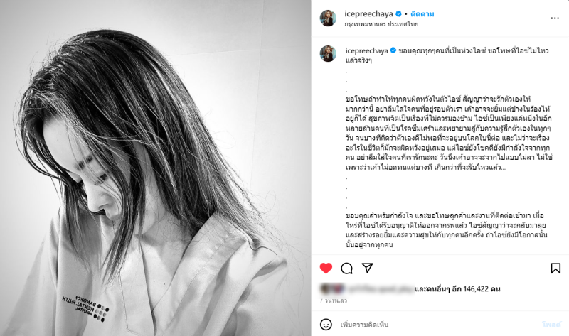 ซึ่งก่อนหน้านั้นไอซ์ได้อัปเดตแล้วผ่านทางอินสตาแกรม พร้อมระบุข้อความว่า ขอบคุณทุกๆคนที่เป็นห่วงไอซ์ ขอโทษที่ไอซ์ไม่ไหวแล้วจริงๆ