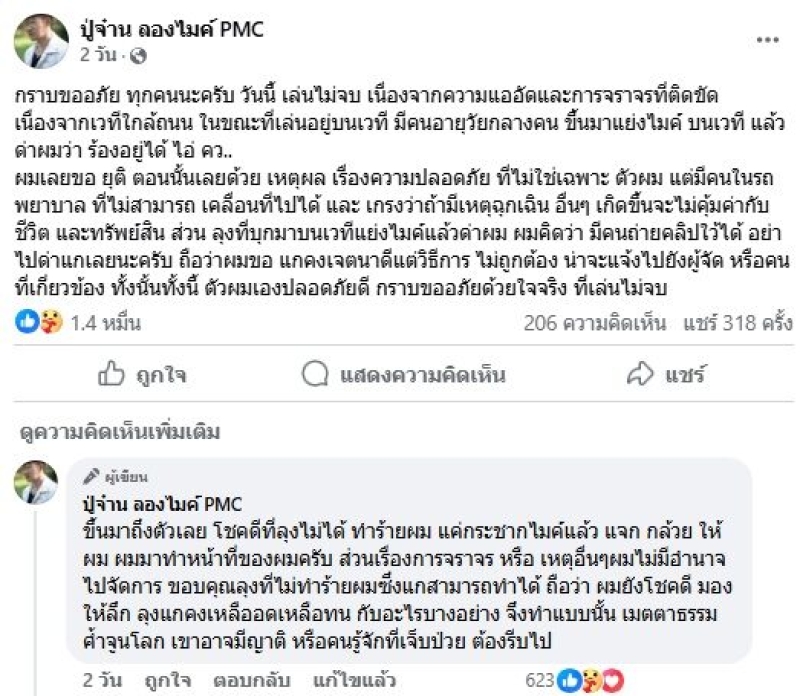 ซึ่งข้อความดังกล่าว ได้ระบุดังนี้ว่า โดนแย่งไมค์ รถติดขึ้นเวทีแจกกล้วย โดยจากเหตุการณ์ภายในคลิปวิดิโอดังกล่าว จะสังเกตได้ว่าด้าน ปู่จ๋าน มีทีท่าที่ตกใจเป็นอย่างมาก จนเจ้าตัวถึงกับพูดออกไมค์ทันทีเลยว่า รถพยาบาล ขณะเดียวกัน ปู่จ๋าน ก็ได้ออกมาชี้แจงถึงเหตุการณ์ดังกล่าวผ่านเฟสบุ๊กอีกครั้งว่า ตนได้ยุติการแสดงแบบกลางคัน เหตุมาจากเวทีใกล้ถนน ทำการจราจรติดขัด ก่อนที่จะมีลุงมาแย่งไมค์และด่ากลางเวที เจ้าตัวจึงตัดสินใจหยุดเล่นทันที เพื่อความปลอดภัยของทุกคน พร้อมยืนยันตนปลอดภัยดี และขอให้แฟนๆอย่าต่อว่าลุงดังกล่าว เชื่อว่าเจตนาดีแค่ใช้วิธีการสื่อสารที่ผิด