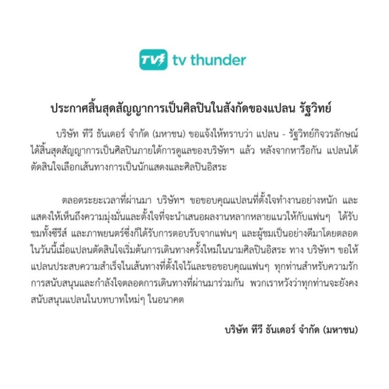ทั้งนี้ แปลน ได้เผิดใจว่า ขอบคุณทางบริษัท @tvthunderseries ครับ ตลอด 3 ปีที่ผ่านมา ขอบคุณโอกาสดีๆ และประสบการณ์ทุกอย่างที่ได้เรียนรู้ ที่ทำให้แปลนเติบโตขึ้น ขอบคุณคนของแปลน ที่อยู่เคียงข้างกันมาตลอด ไม่ว่าจะอยู่ตรงไหน แปลนสัญญาจะตั้งใจทำทุกงานให้ดีที่สุด ฝากติดตามเส้นทางใหม่เร็วๆ นี้นะครับ #คนของแปลน