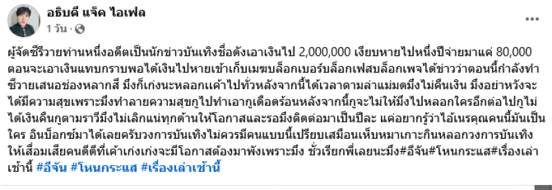 เรียกได้ว่าเป็นอีกหนึ่งเรื่องราวสะเทือนวงการผู้จัดเมื่อล่าสุดทางด้านนักร้องยุค 90 อย่าง แจ็ค ไอเฟล หรือ แจ็ค อธิบดี อดีตนักร้องนำวงไอเฟล ได้ออกมาโพสต์เดือดผ่านทางเฟซบุ๊ค อธิบดี แจ็ค ไอเฟล โดยระบุว่า ผู้จัดซีรีวายท่านหนึ่งอดีตเป็นนักข่าวบันเทิงชื่อดังเอาเงินไป 2,000,000 เงียบหายไปหนึ่งปีจ่ายมาแค่ 80,000 ตอนจะเอาเงินแทบกราบพอได้เงินไปหายเข้าเก็บเมฆ