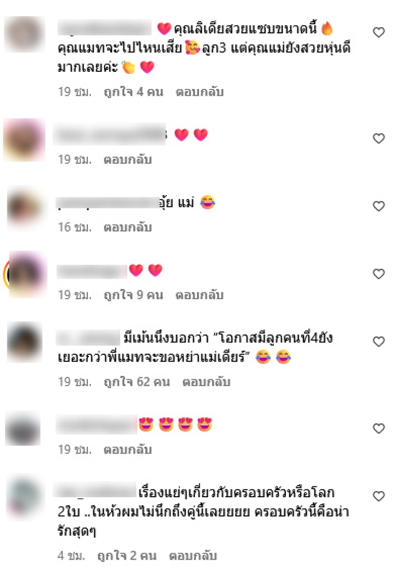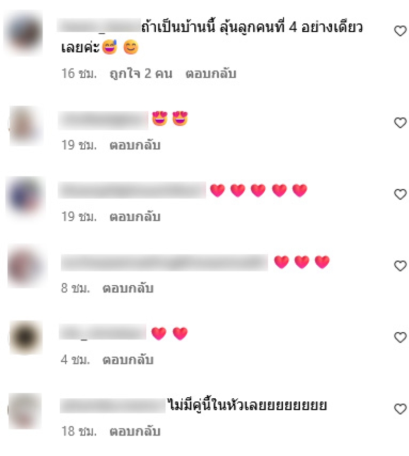 ท่ามกลางชาวเน็ตต่างเข้ามาคอมเมนต์กันอย่างมาก อาทิ เรื่องแย่ๆเกี่ยวกับครอบครัวหรือโลก2ใบ ..ในห้วผมไม่นึกถึงคู่นี้เลยยยย ครอบครัวนี้คือน่ารักสุดๆ,ถ้าเป็นบ้านนี้ ลุ้นลูกคนที่ 4 อย่างเดียวเลยค่ะ,ไม่มีคู่นี้ในหัวเลย เป็นต้น
