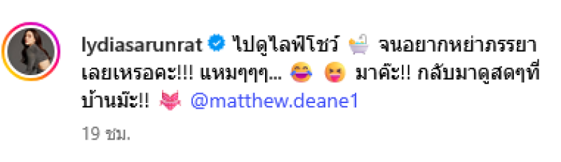 เรียกได้ว่าเป็นอีกหนึ่งคู่รักลูก 3 สำหรับ ลิเดีย ศรัณย์รัชต์ ดีน และ แมทธิว ดีน ที่ต้องบอกเลยว่าขาเตียงยังมั่นคงแข็งแรงสุดๆ ล่าสุดทางด้าน ลิเดีย ได้ออกมาโฑสต์ภาพพร้อมแคปชั่นแซวสามีผ่านทางอินสตาแกรม lydiasarunrat ระบุว่า ไปดูไลฟ์โชว์ จนอยากหย่าภรรยาเลยเหรอคะ!!! แหมๆๆๆ...มาค๊ะ!! กลับมาดูสดๆที่บ้านม๊ะ!!