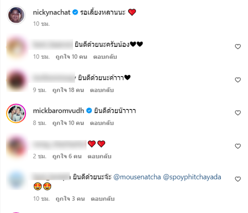 ขอแสดงความยินดี กับ เม้าส์ ณัฐชา น้องชายของ นิกกี้ ณฉัตร และแฟนสาว สปอย พิชญดา ที่ได้ควงแขนเข้าประตูวิวาห์ด้วยกันแล้ว ซึ่งก่อนหน้านั้นทางเมาส์เองก็ได้คุกเข่าขอแฟนสาวแต่งงาน ที่ญี่ปุ่นท่ามกลางอากาศหนาวๆ และล่าสุดทั้งคู่เองก็ได้เข้าพิธีเรียบร้อยแล้ว