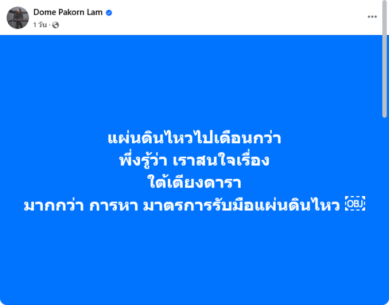 เรียกได้ว่าเป็นอีกหนึ่งคู่รักที่โดนโยงคู่รักมีโลก2ใบสำหรับนักร้องหนุ่ม โดม ปกรณ์ ลัม ที่ล่าสุดได้ออกมาโพสต์ข้อความผ่านทางเฟซบุ๊ค Dome Pakorn Lam ระบุว่า แผ่นดินไหวไปเดือนกว่า พึ่งรู้ว่า เราสนใจเรื่อง ใต้เตียงดารา มากกว่า การหา มาตรการรับมือแผ่นดินไหว