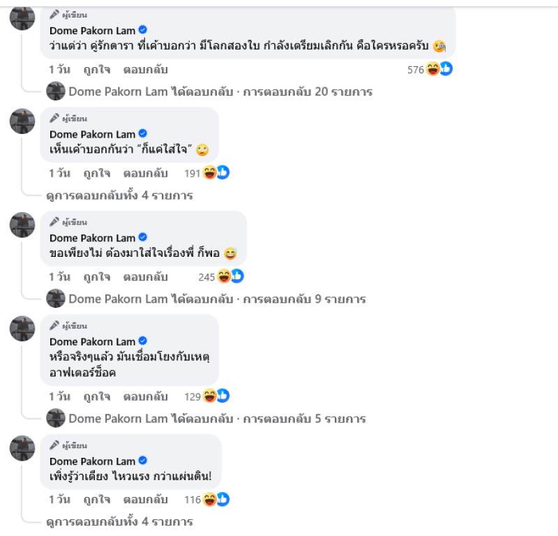 พร้อมทั้งยังเขียนคอมเมนต์เพิ่มเติมอีกว่า ว่าแต่ว่า คู่รักดารา ที่เค้าบอกว่า มีโลกสองใบ กำลังเตรียมเลิกกัน คือใครหรอครับ,เห็นเค้าบอกกันว่า ก็แค่ใส่ใจ,ขอเพียงไม่ ต้องมาใส่ใจเรื่องพี่ ก็พอ,หรือจริงๆแล้ว มันเชื่อมโยงกับเหตุ อาฟเตอร์ช็อค เป็นต้น