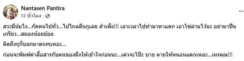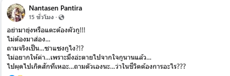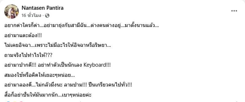 เรียกได้ว่าทำเอาชาวเน็ตต่างฮือฮากันอย่างมากหลังภรรยานักร้องดังอย่าง อ้อ พรรทิรา ภรรยาของ ติ๊ก ชิโร่ ได้ออกมาโพสต์เฟซบุ๊ค Nantasen Pantira ระบุว่า อยากด่าใครก็ด่า...อย่ามายุ่งกับสามีฉัน...ต่างคนต่างอยู่...มาตั้งนานแล้ว... อย่ามาแตะต้อง!!! ไม่เคยอิจฉา...เพราะไม่มีอะไรให้อิจฉาหรือริษยา... อย่ามาลองดี... ถามจริงไปทำไรให้???